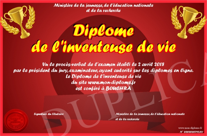 Envoyez par email votre Diplôme de l'inventeuse de vie personalisé