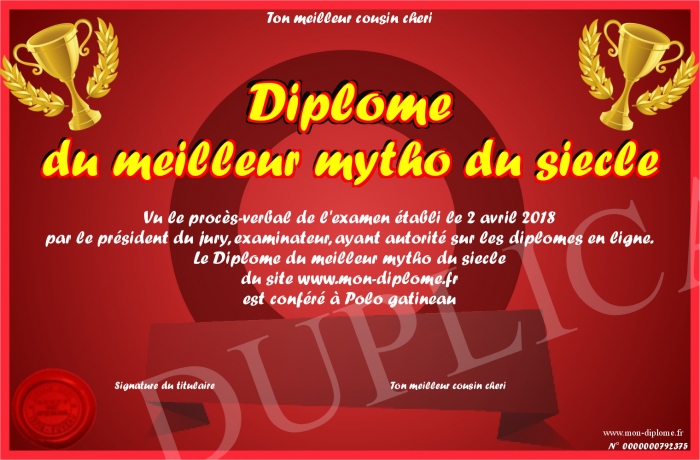 Envoyez par email votre Diplôme du meilleur mytho du siecle personalisé