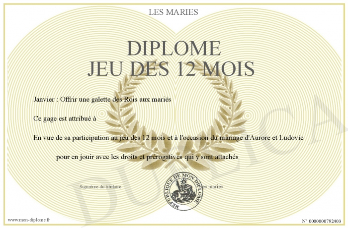 Envoyez par email votre Diplôme Jeu des 12 mois personalisé