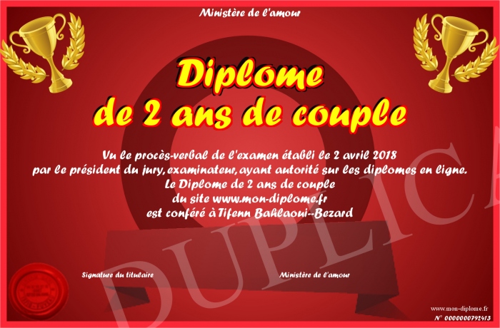 Envoyez par email votre Diplôme de 2 ans de couple personalisé