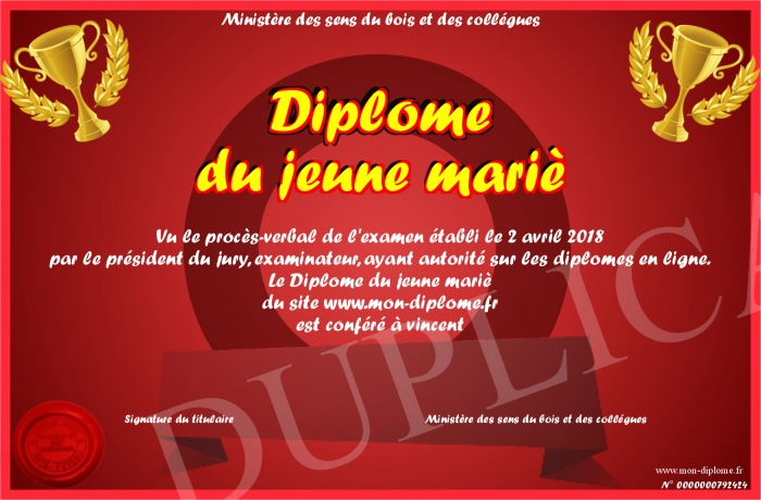Envoyez par email votre Diplome du jeune mariè personalisé