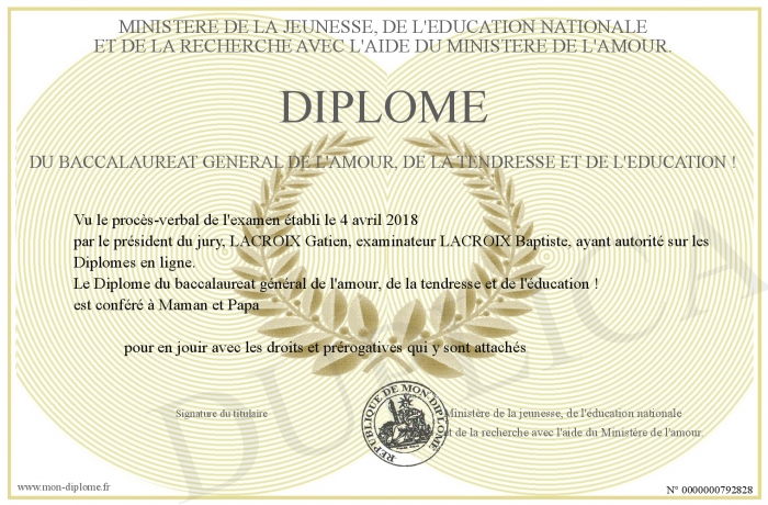 Envoyez par email votre Diplôme du baccalaureat général de l'amour, de la tendresse et de l'éducation ! personalisé