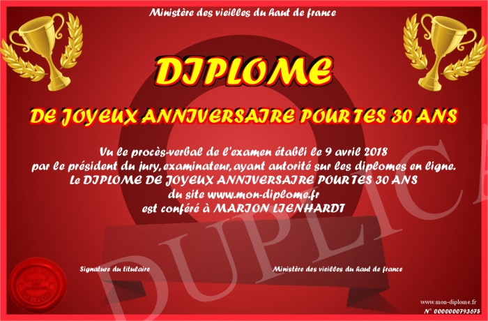 Envoyez par email votre DIPLOME DE JOYEUX ANNIVERSAIRE POUR TES 30 ANS personalisé