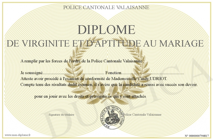 Envoyez par email votre Diplôme de Virginité et d'Aptitude au Mariage personalisé