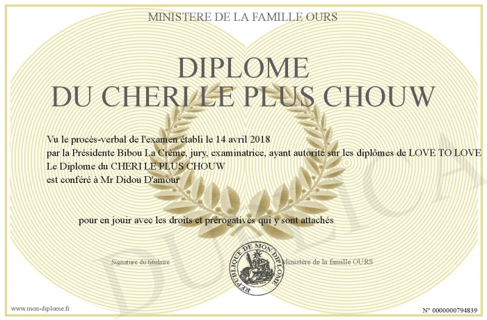 Envoyez par email votre Diplôme du CHERI LE PLUS CHOUW personalisé