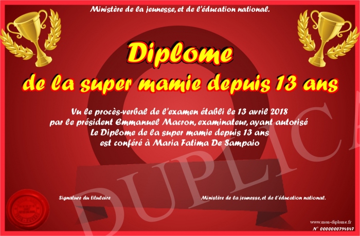 Envoyez par email votre Diplôme de la super mamie depuis 13 ans personalisé