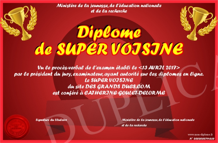 Envoyez par email votre Diplôme de SUPER VOISINE personalisé