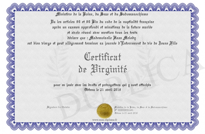 Envoyez par email votre Certificat de Virginité personalisé