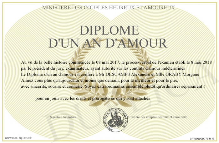 Envoyez par email votre Diplôme d'un an d'amour personalisé