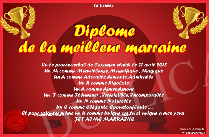 Envoyez par email votre Diplôme de la meilleur marraine personalisé