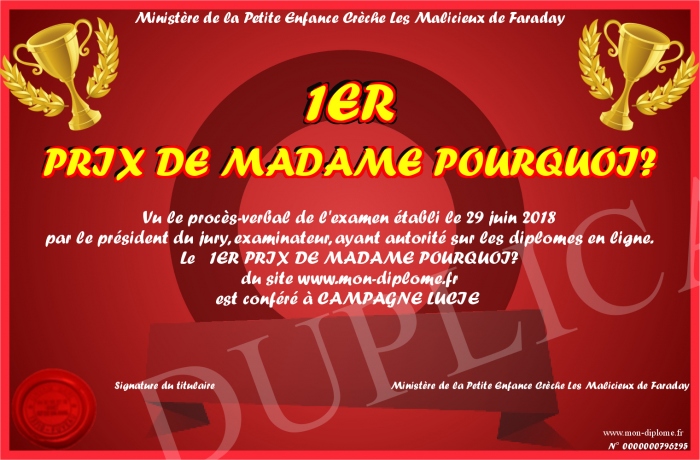 Envoyez par email votre 1ER PRIX DE MADAME POURQUOI? personalisé