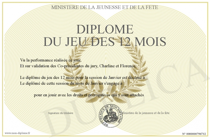Envoyez par email votre Diplôme du Jeu des 12 mois personalisé