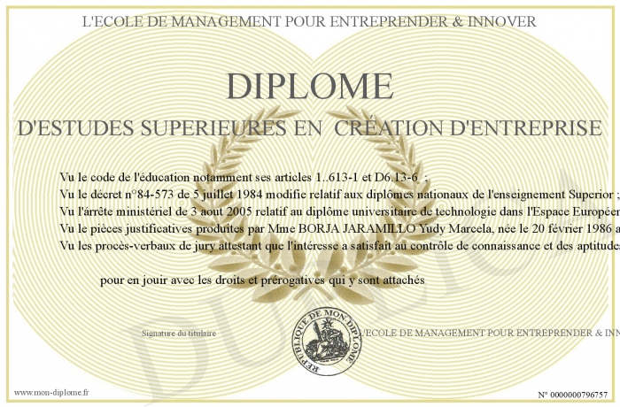 Envoyez par email votre DIPLOME d'Estudes Supérieures en CRÉATION D'ENTREPRISE personalisé