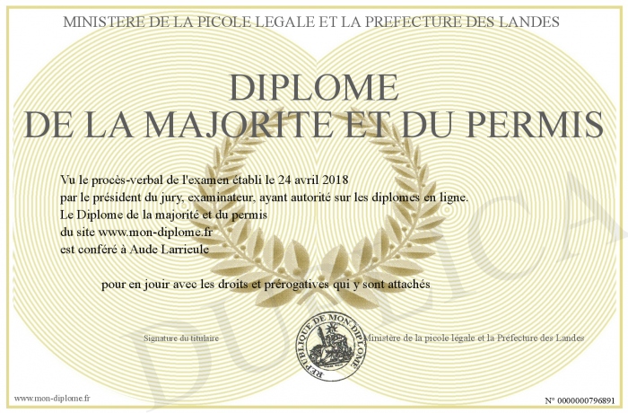 Envoyez par email votre Diplôme de la majorité et du permis personalisé