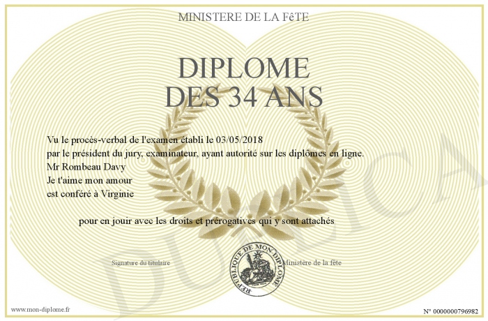 Envoyez par email votre Diplôme des 34 Ans personalisé