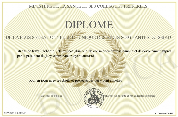 Envoyez par email votre Diplôme de la plus sensationnelle et unique des aides soignantes du SSIAD personalisé