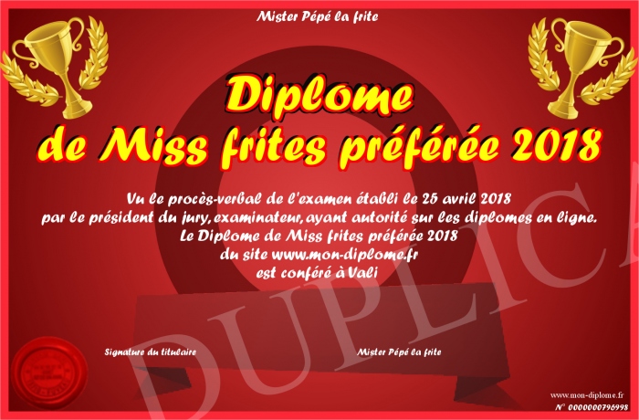 Envoyez par email votre Diplôme de Miss frites préférée 2018 personalisé