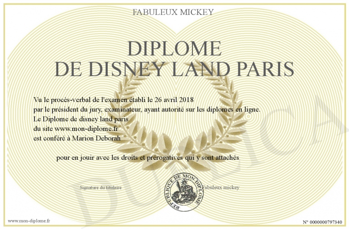 Envoyez par email votre Diplôme de disney land paris personalisé