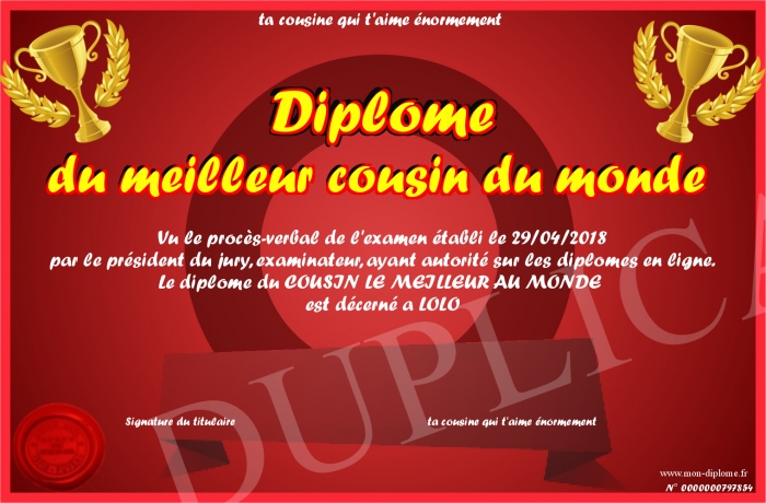 Envoyez par email votre Diplôme du meilleur cousin du monde personalisé