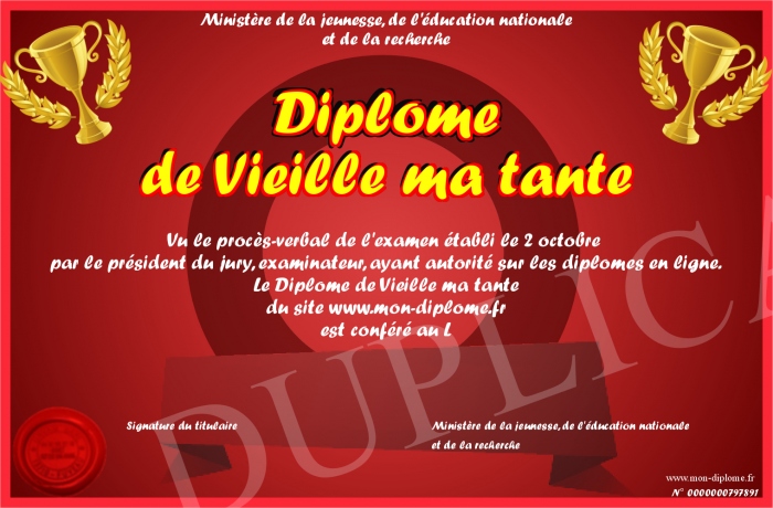 Envoyez par email votre Diplôme de Vieille ma tante personalisé