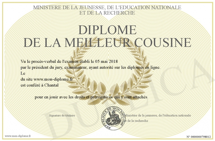 Envoyez par email votre Diplôme de la meilleur cousine personalisé