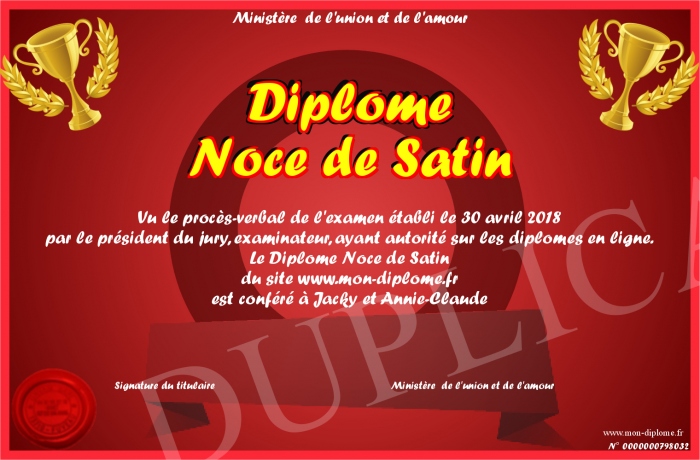 Envoyez par email votre Diplôme Noce de Satin personalisé