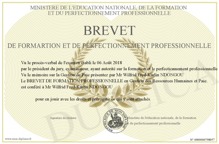 Envoyez par email votre BREVET DE FORMARTION ET DE PERFECTIONNEMENT PROFESSIONNELLE personalisé