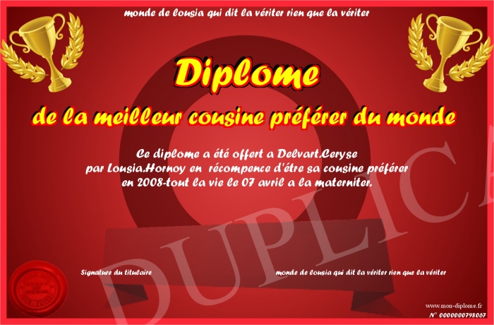 Envoyez par email votre Diplôme de la meilleur cousine préférer du monde personalisé