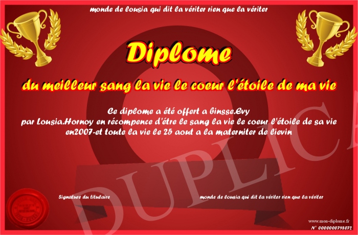 Envoyez par email votre Diplôme du meilleur sang la vie le coeur l'étoile de ma vie personalisé