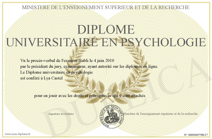 Envoyez par email votre Diplôme universitaire en psychologie personalisé