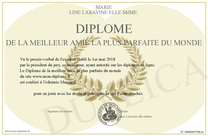 Envoyez par email votre Diplôme de la meilleur amie la plus parfaite du monde personalisé