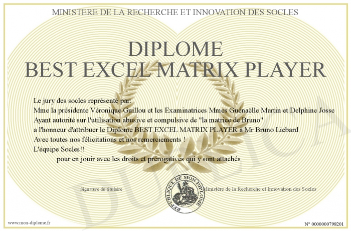 Envoyez par email votre Diplôme BEST EXCEL MATRIX PLAYER personalisé