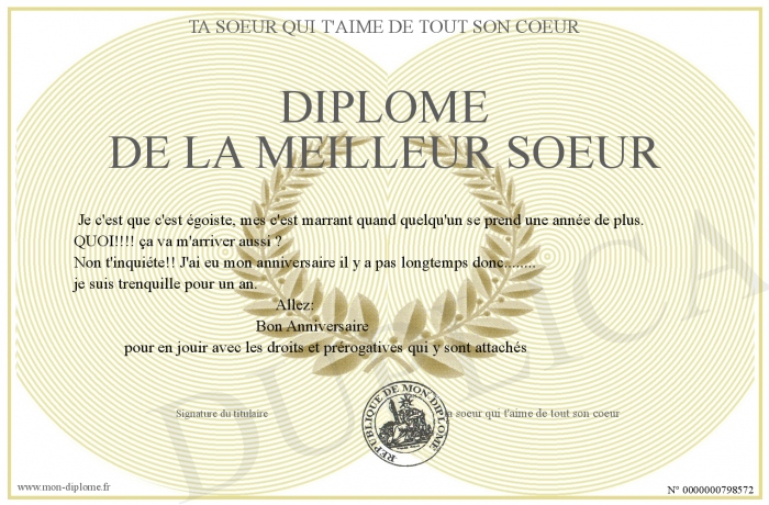 Envoyez par email votre Diplôme de la meilleur soeur personalisé