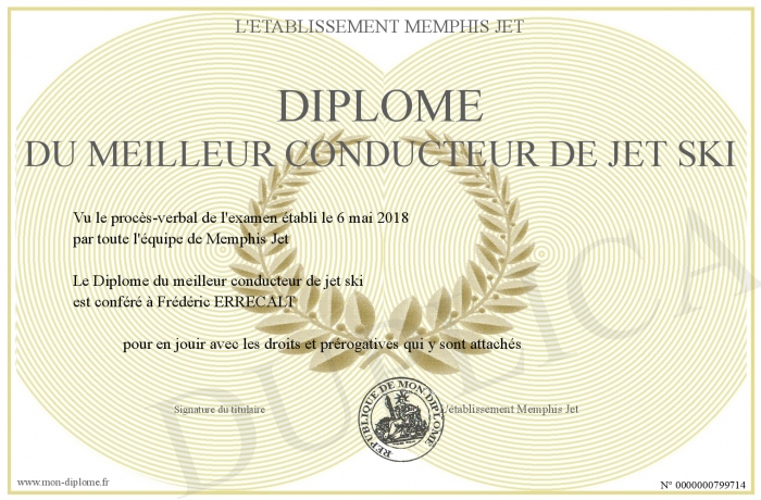 Envoyez par email votre Diplôme du meilleur conducteur de jet ski personalisé