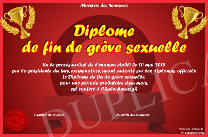 Envoyez par email votre Diplôme de fin de grève sexuelle personalisé