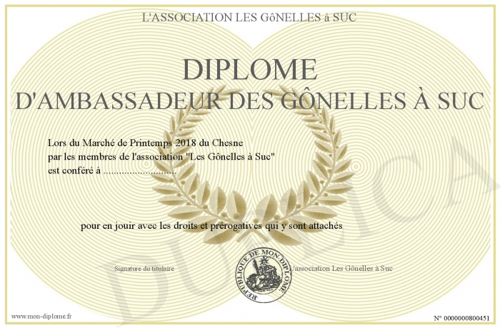 Envoyez par email votre Diplôme d'Ambassadeur des GÔnelles À Suc personalisé