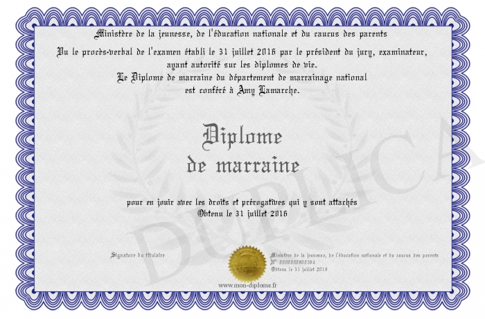 Envoyez par email votre Diplome de marraine personalisé