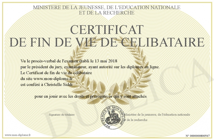 Envoyez par email votre Certificat de fin de vie de célibataire personalisé