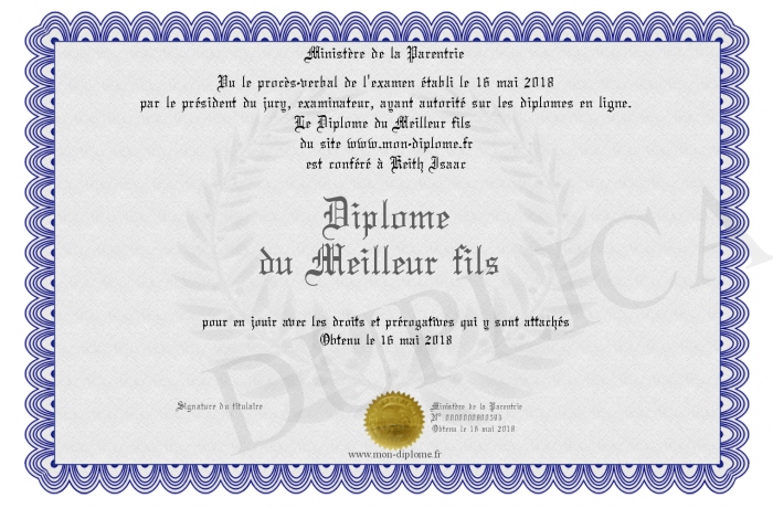 Envoyez par email votre Diplôme du Meilleur fils personalisé