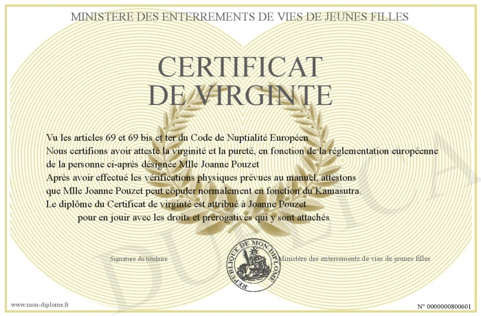 Envoyez par email votre Certificat de virginté personalisé