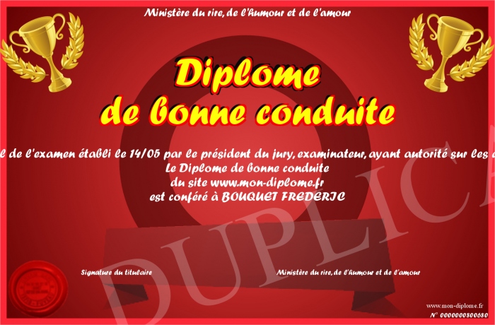 Envoyez par email votre Diplome de bonne conduite personalisé