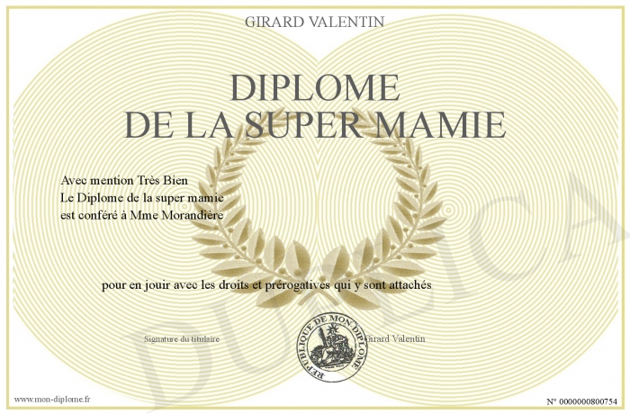 Envoyez par email votre Diplôme de la super mamie personalisé