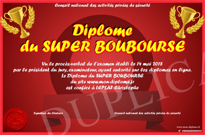 Envoyez par email votre Diplôme du SUPER BOUBOURSE personalisé