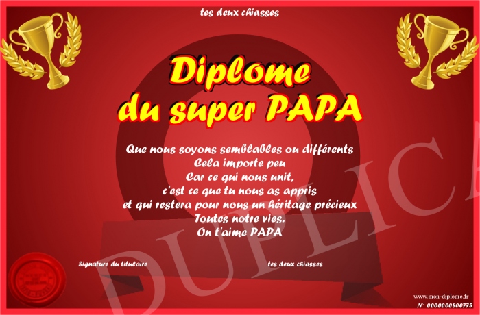 Envoyez par email votre Diplôme du super PAPA personalisé
