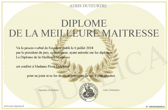 Envoyez par email votre Diplôme de la Meilleure Maitresse personalisé