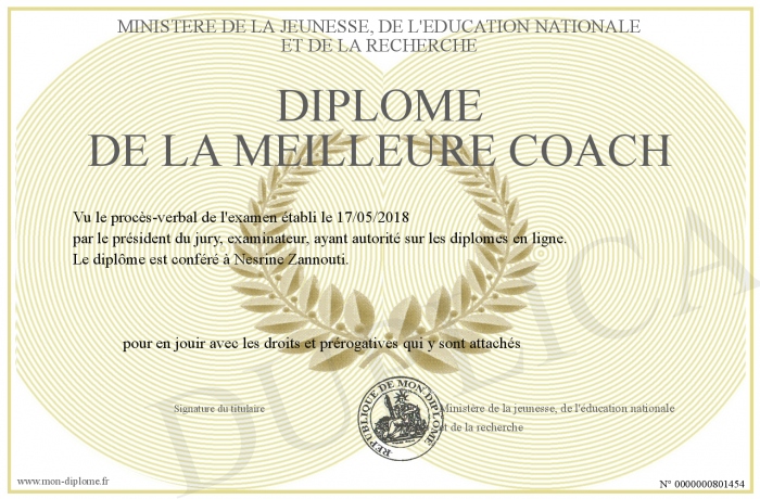 Envoyez par email votre Diplôme de la meilleure coach personalisé