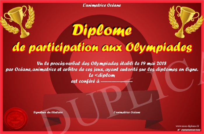 Envoyez par email votre Diplôme de participation aux Olympiades personalisé
