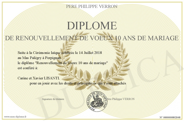 Envoyez par email votre Diplôme de Renouvellement de Voeux 10 ans de Mariage personalisé