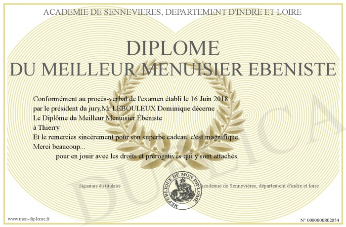 Envoyez par email votre Diplôme du Meilleur Menuisier Ebéniste personalisé