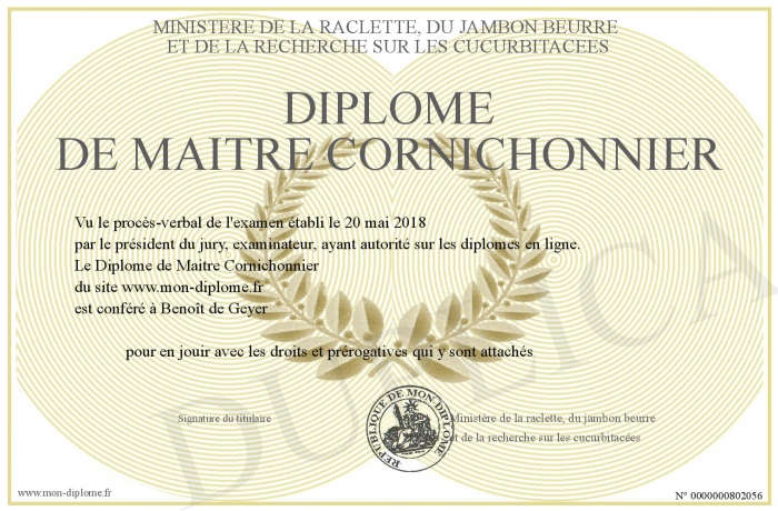 Envoyez par email votre Diplôme de Maitre Cornichonnier personalisé